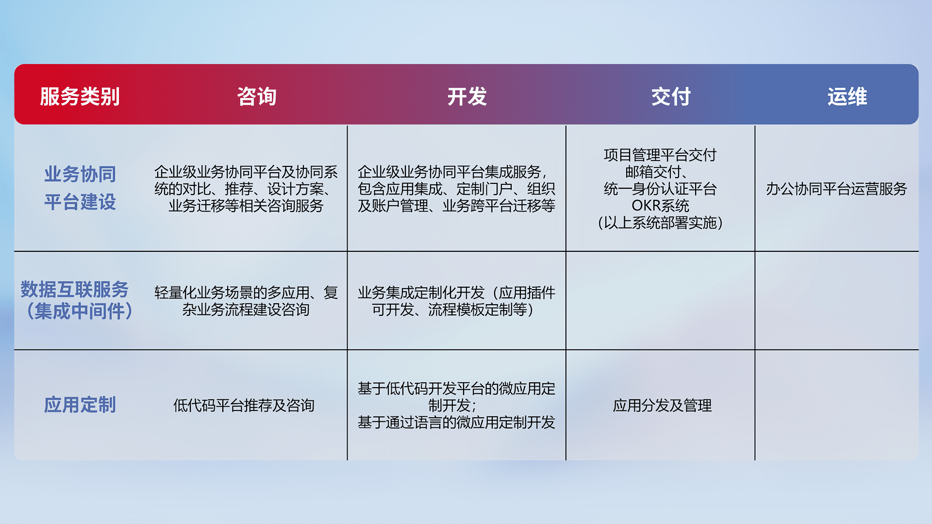 针对钉钉、、、企微、、、、IDaas等平台级产品提供产品的规划、、、方案、、、交付、、定制化开发等服务,,实现如统一协同办公、、、智能客户服务、、混合会议管理、、、、智能数据查询、、等业务场景,,实现数字化转型。。